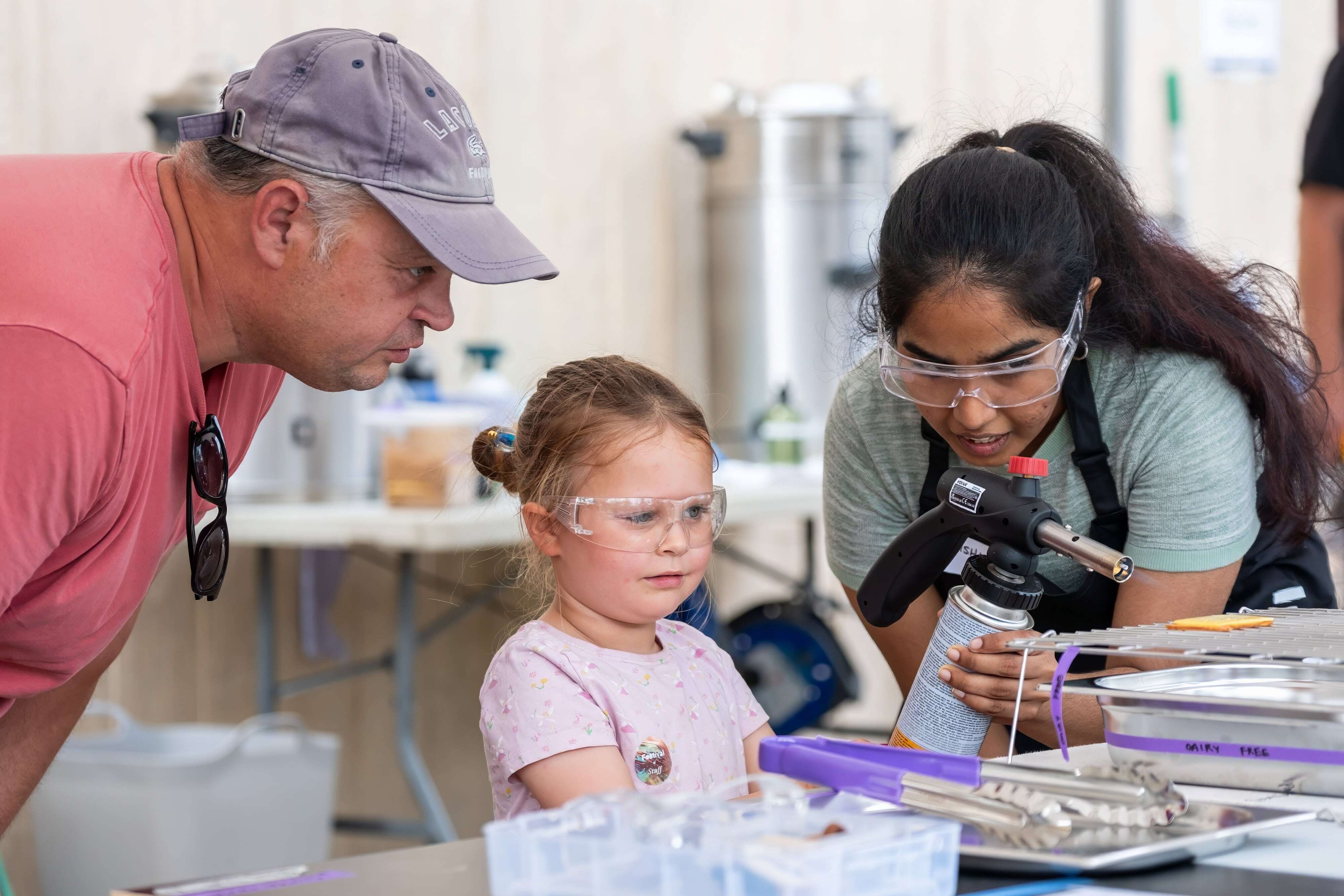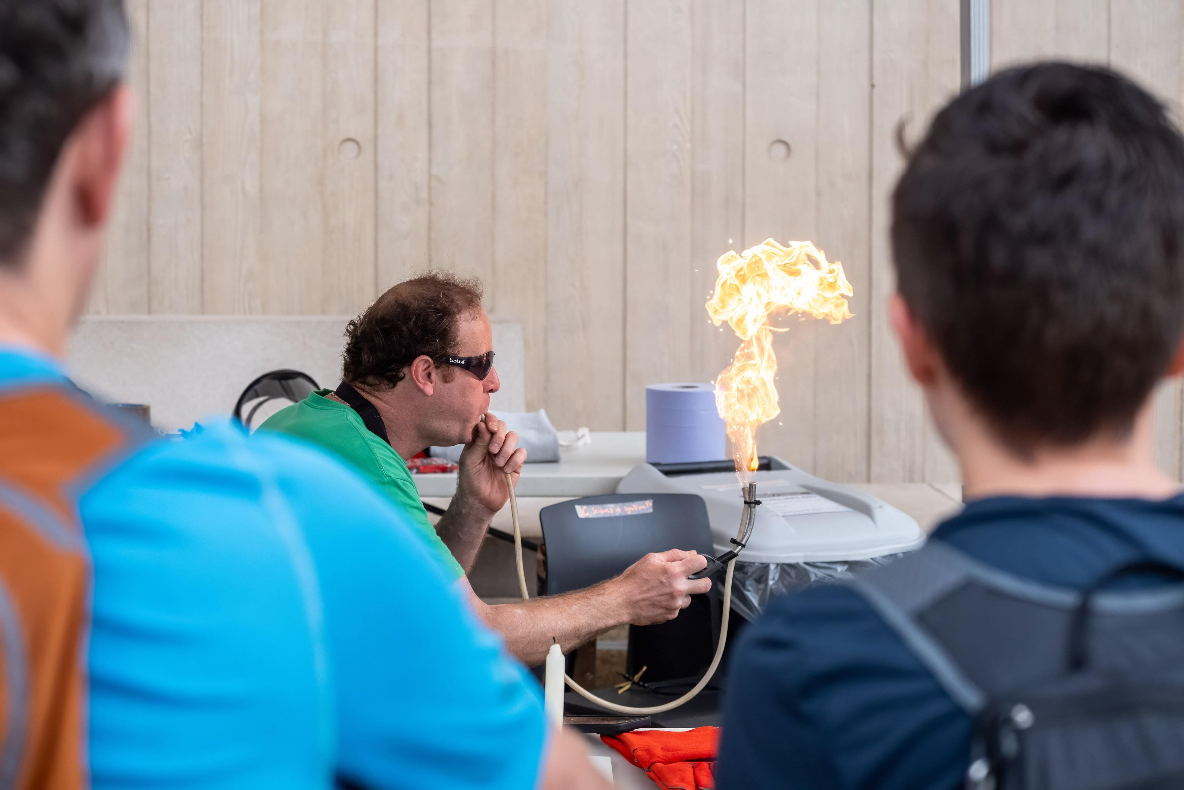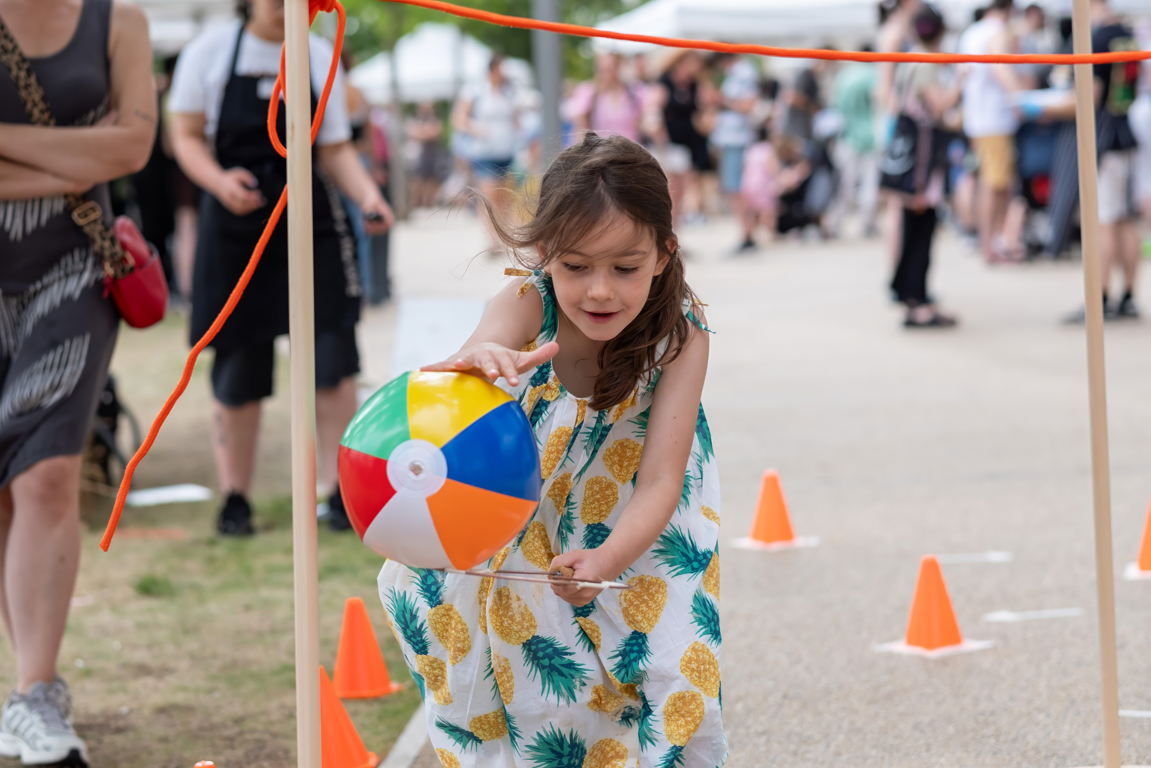 Our Science of Ignition stand brought the heat back, as chemist Andres and physicist Jess used gases to conduct bright, colourful flame tests, creating blazes, sparks and smokes. A sweat was also worked up at our Bernoulli Games obstacle courses, with people testing their skills, speed and hand-eye coordination whilst using fluid dynamics to their advantage, keeping balls of varying sizes afloat in the air streams of hairdryers and fans.