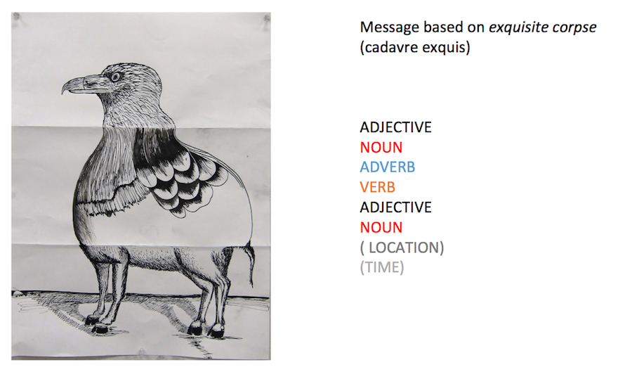 The message will have the structure of an Exquisite Corpse (from the French Cadaver Exquis), a creative method to produce sentences devised by the surrealists in 1918. If the original game is meant to be a collaborative bit of poetry, the device imagined for this project will by itself produce the message, in an interactive and didactic relationship with the public.”