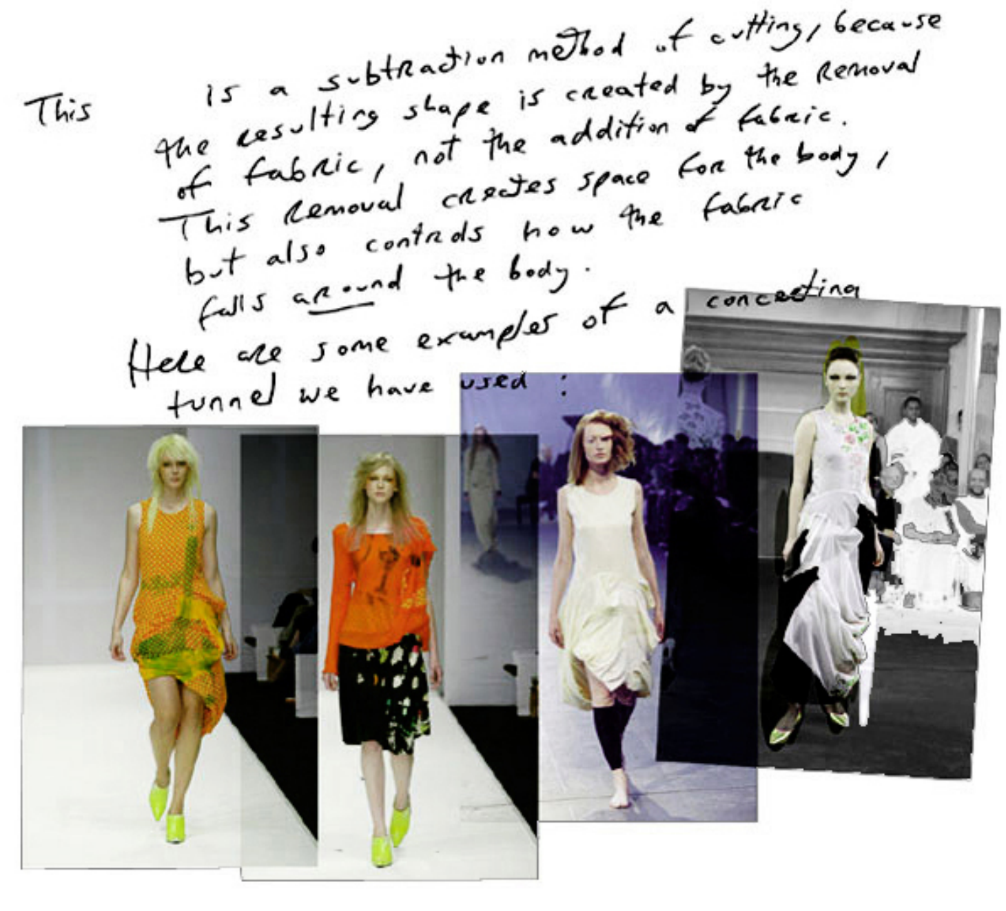 Subtraction pattern cutting is a technique developed by Julian Roberts. The reverse of traditional pattern cutting, Julian’s method looks at removing shapes from a flat material, to create empty spaces for the body to occupy. He describes it as “an approach to garment making that incorporates chance discovery, distance and the ability to cut fast and inaccurately without too much reference to numbers, fractions or sizing scales.” This is because the garment design comes from the process of pattern cutting itself, rather than working backwards to create a net after the final design of a garment is imagined.