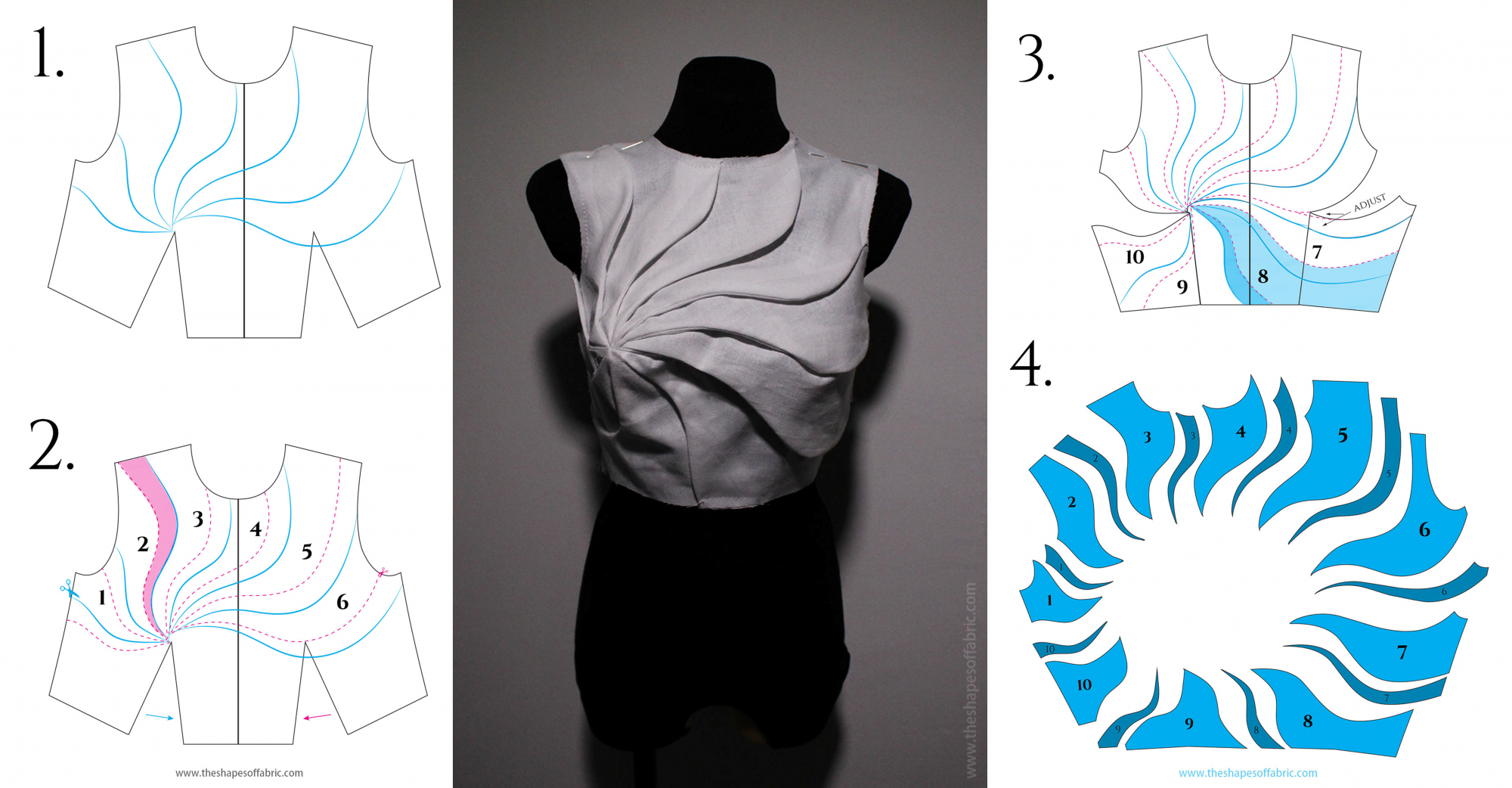 Similar methods can be learnt through the Pattern Magic book series by Tomoko Nakamichi, or the Transformation Reconstruction technique developed by Shingo Sato. A key feature of these methods involves breaking the basic block into multiple pieces, so that when seams meet, it results in a highly sculptural design.