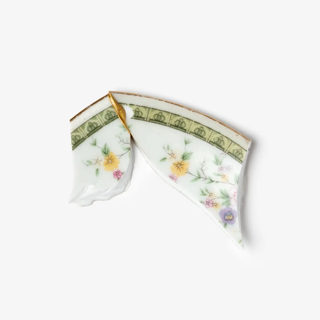 This particular plate rim has been glued back together using faux kintsugi. Faux kintsugi replicates the Japanese mending technique that traditionally employs urushi lacquer and gold powder to create delicate and deliberately visible repairs, but this version uses less toxic and expensive materials such as gold enamel paint, acrylic paint, glue and brass gilding powder. It was made in 2022 during a Festival of Stuff masterclass where Bridget led a public group in experimental ceramic repair.