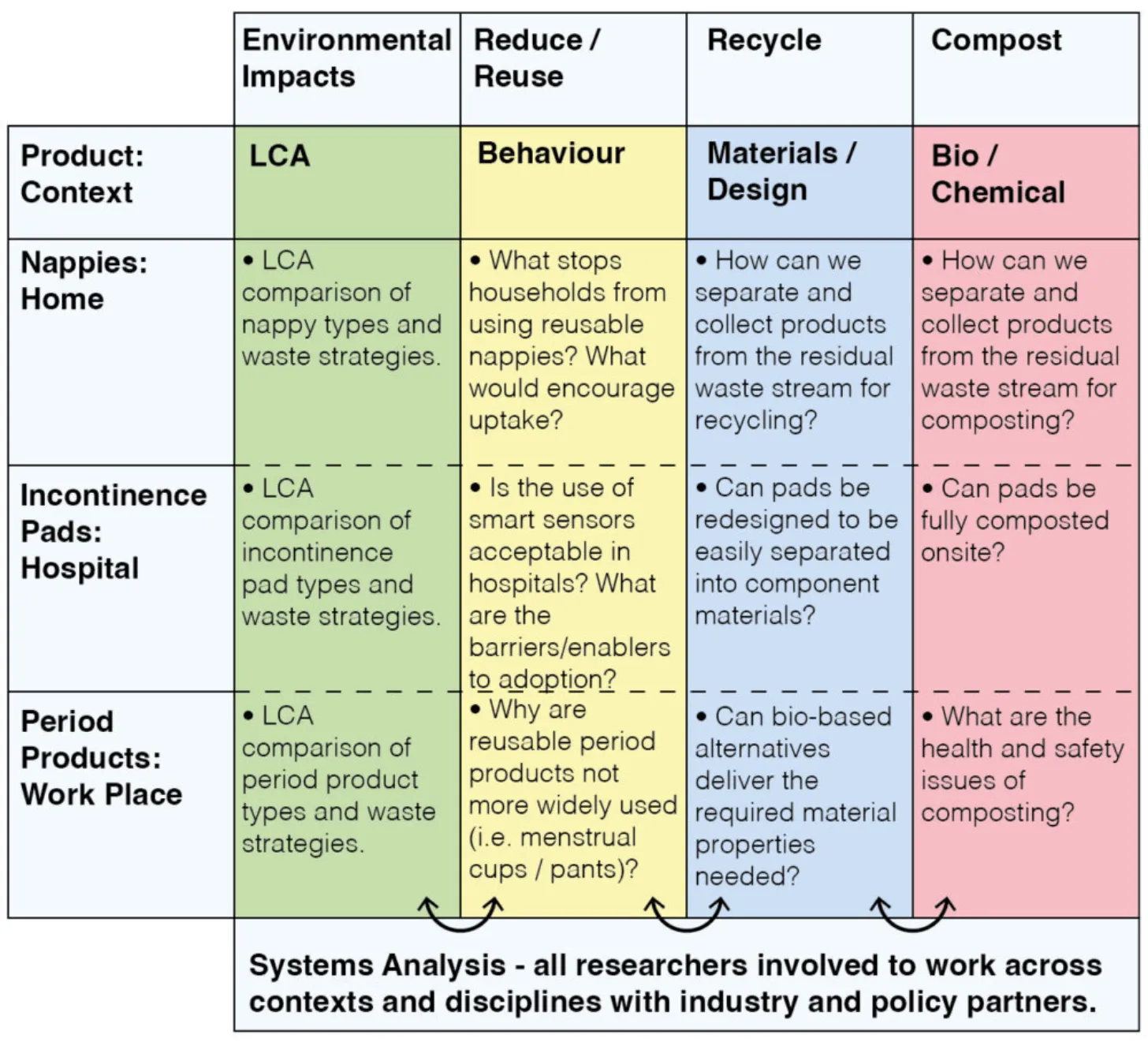 The programme studies three types of products: nappies, incontinence pads and period products. For each of these the team are analysing use models for reduce, reuse, recycling and composting. The Hub is taking a whole systems approach with a multidisciplinary perspective using four lenses: (1) Life Cycle Analysis, (2) Behavioural Analysis, (3) Materials & Design, and (4) Bio/Chemical. Three context specific settings that need realistic solutions have been identified. These are the home setting, the healthcare setting, and the office/workplace setting. The programme goal is to analyse the barriers and enablers for circular solutions that work in these settings but that are generalisable across AHPs. To manage the ambitious scope of this project the programme pairs reduce/reuse approaches to Behavioural Analysis, recycling approaches to Materials/Design approaches, and bio/chemical approaches to Composting solutions. This creates a matrix of research questions, each important in their own right but acknowledges that they will be context specific. Uniquely, this supports the development and comparison of circular strategies using Life Cycle Assessment.