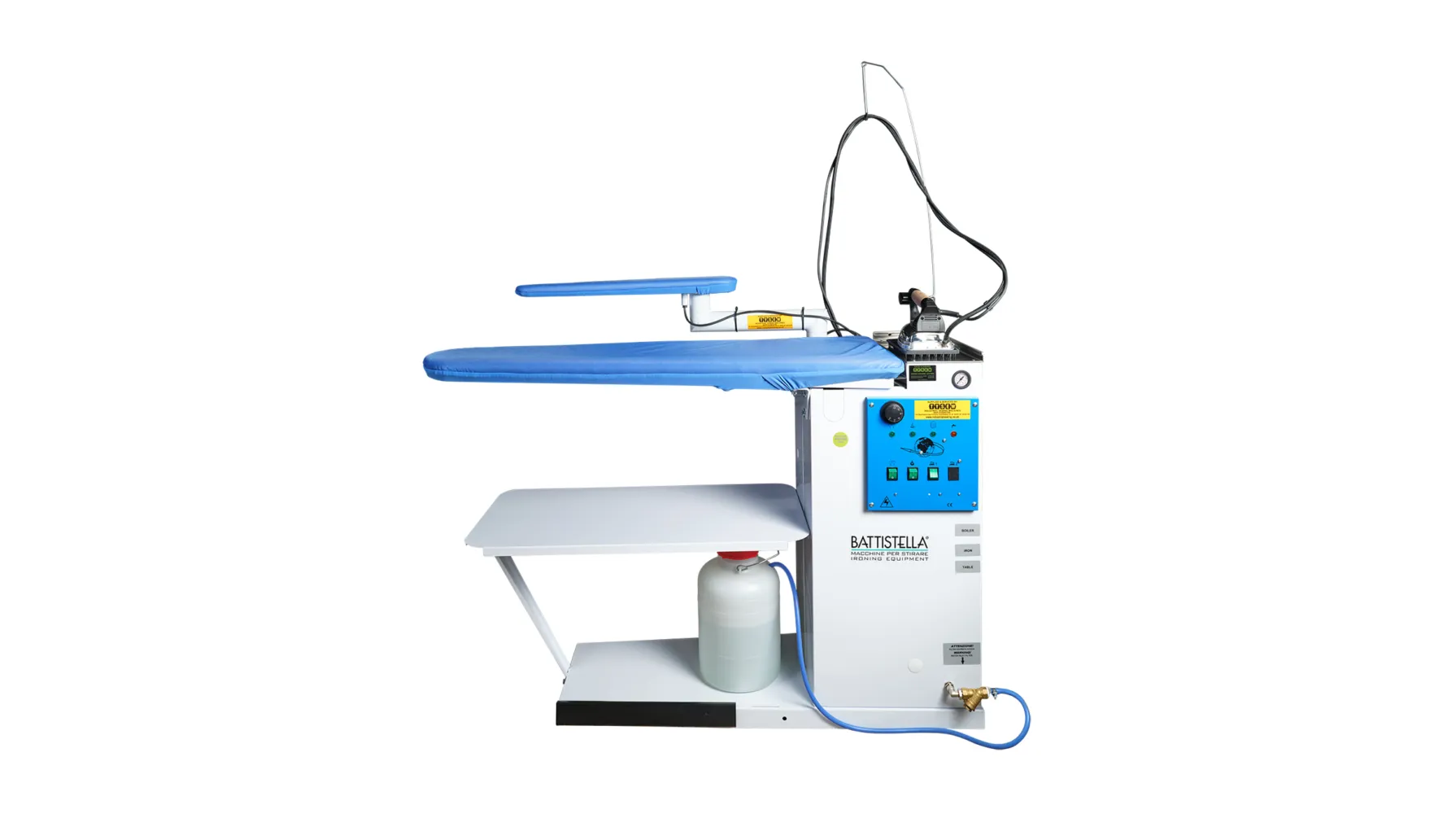 Heated and vacuum ironing board equipped with boiler and iron.